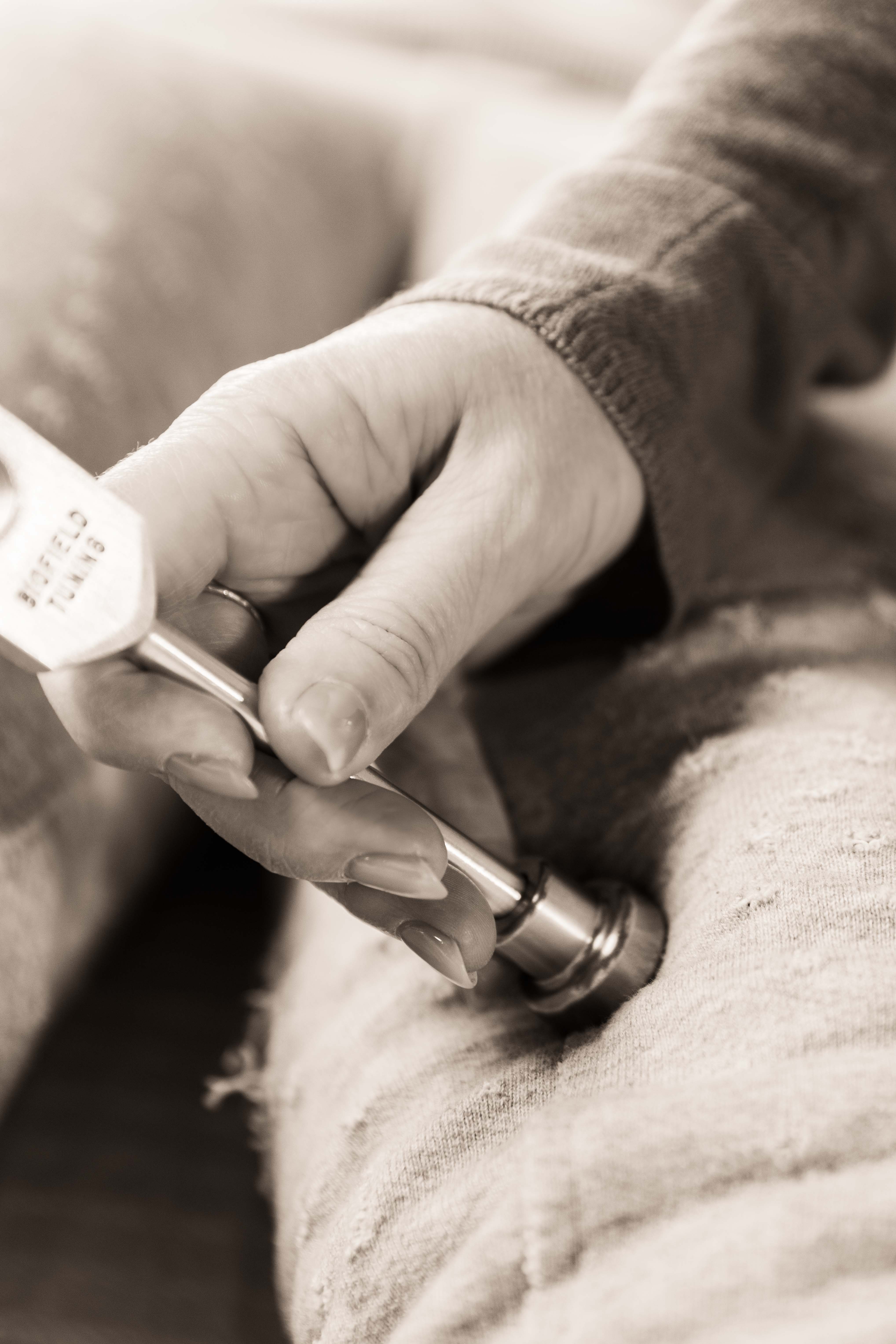 During a session, tuning forks are used on and around the body. Sound and vibration create a spacious environment where the body can soften, recalibrate, and return toward a more natural state of flow.